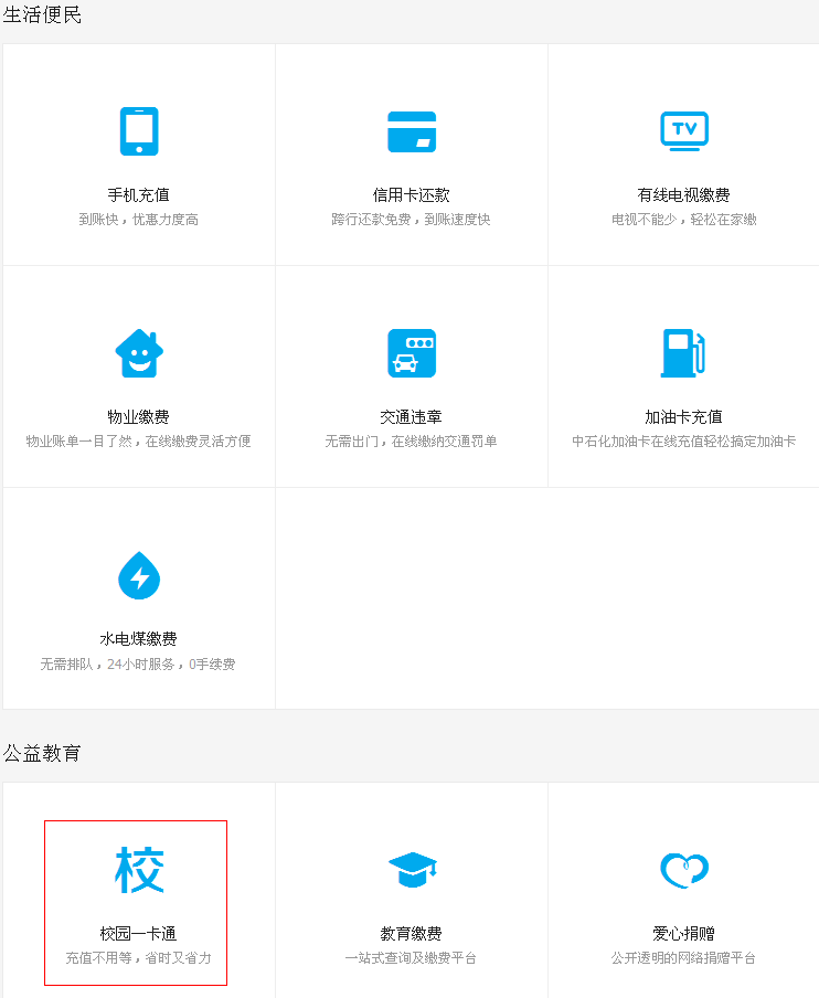 为方便大家校园一卡通充值,学校开通了使用支付宝为校园一卡通自助充值的通道(试运行)。