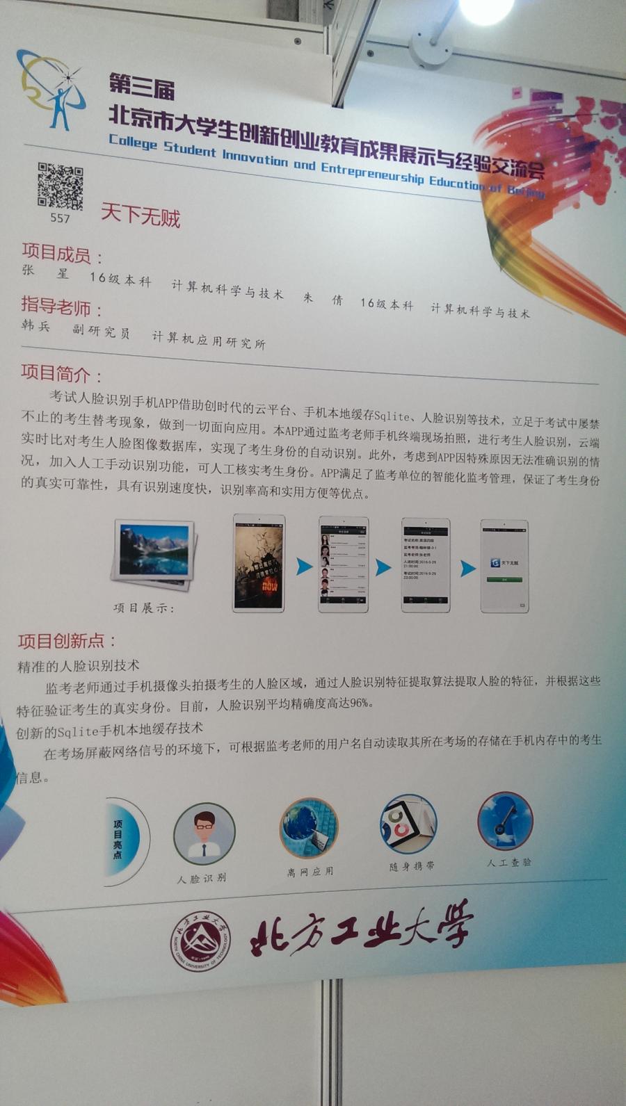 由beat365官网教师韩兵老师指导,beat365官网2016级计算机科学与技术专业学生张星、朱倩研发的“天下无贼”——考试人脸识别手机APP项目应邀参加此次展出。前来参观的部分师生对此项目产生了兴趣,并在现场进行了亲身体验。此次参展展示了beat365官网beat365官方网站学生的计算机设计应用水平,对广大在校生产生了鼓舞作用。此前该项目已荣获2016年北京高等学校继续教育大学生计算机设计应用竞赛二等奖。