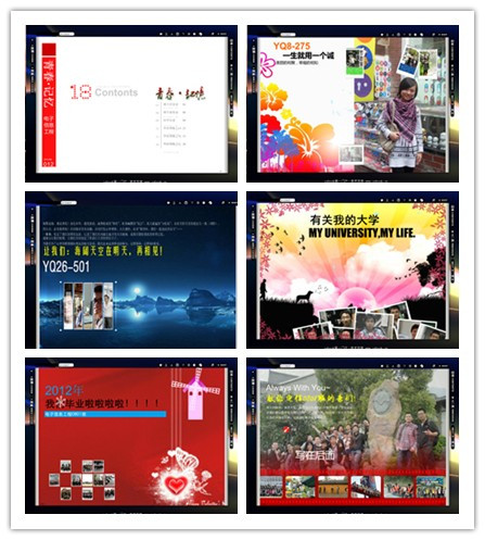 此次制作的纪念册包括班主任寄语、班干部寄语、同学风采、毕业图集四个部分,寄语部分承载了师生情和同学情,同学风采部分以寝室为单位,分别用寝室合照和寝室成员个人生活照配解说的形式展示了每个寝室的特色,而毕业图集回忆了两年来班级的主要活动,是唤起共鸣的重要部分。毕业纪念册采用电子书的形式,成本低,传递方便,并且动态效果出色,具有纸质纪念册无法比拟的优点。