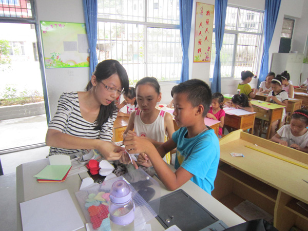 高年级组按照课程计划是“动手制作与创新”,由魏梦带领四年级、五年级的同学进行一系列的手工实践。魏老师首先耐心地向大家展示如何折叠“桃心”形状的手工制作,并鼓励大家自由发挥,折出更加漂亮的“心”。在大家熟练地掌握折叠技巧后,魏老师给大家每个人发放一张精致的手工纸,并让大家在纸上写上对爸爸妈妈最想说的一句话,最后叠成一个“感恩的心”,送给爸爸妈妈。在每个同学都做好属于自己的“心”之后,魏老师为大家讲解的是七巧板的制作。七巧板的拼接方法变化万千,在魏老师绘声绘色的引导下,同学们拼出了一个个生动的图案。每个人都不断地开动脑筋,他们不仅收获了成功的喜悦,更是得到了独立思考的锻炼。