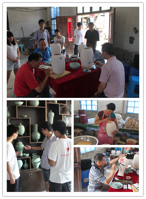所谓来得早不如来得巧,实践队伍前来溪口窑厂调研时正值为厂址搬迁后出窑的第一批青瓷绘花上色,几位来自杭州的艺术工作者应邀为余先生的这批作品细心修饰。来自浙江工人日报的吴编辑和省委党校的朱老师因为爱玩赏瓷器的缘故也随他们前来一亲青瓷艺术的芳泽。几位先生端坐砚前,笔蘸丹青,挥毫而书,很快让原本空白的陶坯变得富有生气:有的绘有盛放牡丹,饱含国色天香之美;有的画作写意山水,深谙高云野鹤之趣。许多件艺术品一蹴而就,姿态万千者不一而足。绘画结束后利用特殊的烧制手法可以使瓶身上的花饰凸出来,形成一种特别的韵致,再上以青釉就完成了一件作品。